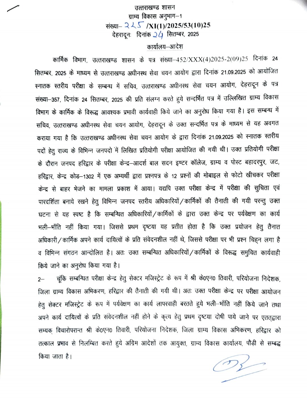 उत्तराखंड अधीनस्थ सेवा चयन आयोग द्वारा आयोजित स्नातक स्तरीय परीक्षा में अनियमितता के मामले में कार्मिक विभाग ने कड़ी कार्रवाई की है। परियोजना निदेशक, जिला ग्राम्य विकास अभिकरण, हरिद्वार के सेक्टर मजिस्ट्रेट केएन तिवारी को निलंबित कर दिया गया है। उन पर आरोप है कि उन्होंने परीक्षा केंद्र पर पर्यवेक्षण का कार्य ठीक से नहीं किया, जिससे एक अभ्यर्थी प्रश्नपत्र के 12 प्रश्नों की फोटो खींचकर बाहर भेजने में सफल रहा।