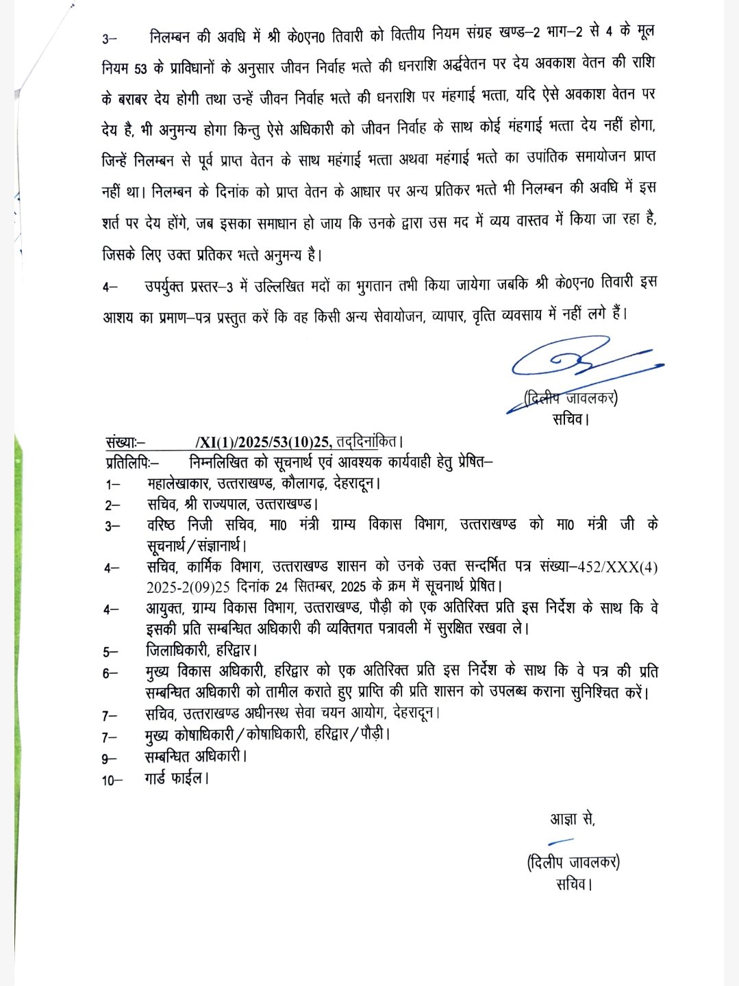 केएन तिवारी को तत्काल प्रभाव से निलंबित कर दिया गया है और उन्हें आयुक्त, ग्राम्य विकास कार्यालय, पौड़ी से सम्बद्ध किया गया है।