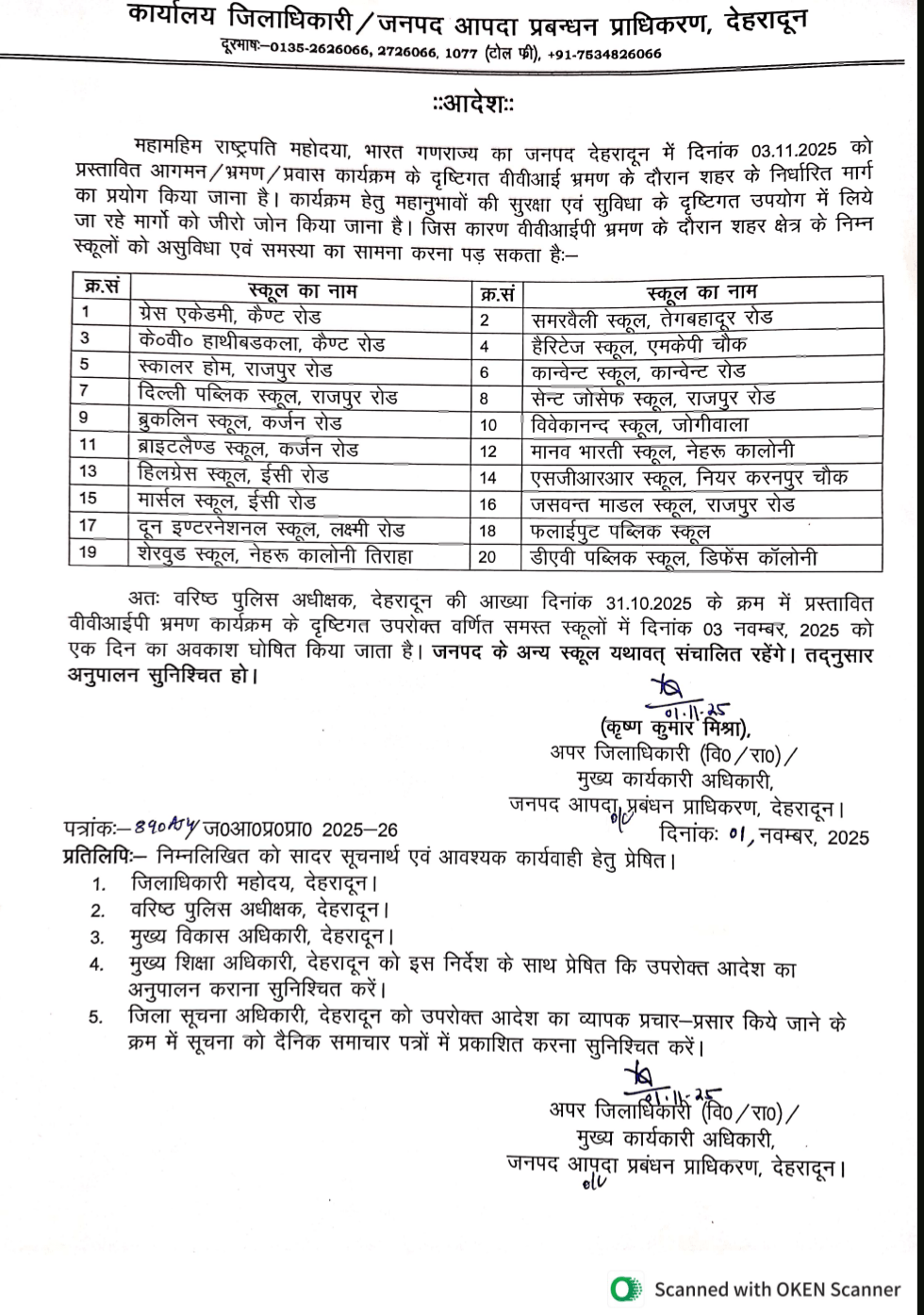 दिनांक 03.11.2025 को देश की राष्ट्रपति द्रौपदी मुर्मू के उत्तराखंड दौरे के दौरान देहरादून में विधानसभा के विशेष सत्र में उपस्थित रहने के कारण शहर के कुछ मार्गों को जीरो जोन किया जाएगा। इस दौरान निम्नलिखित स्कूलों को असुविधा और समस्या का सामना करना पड़ सकता है: